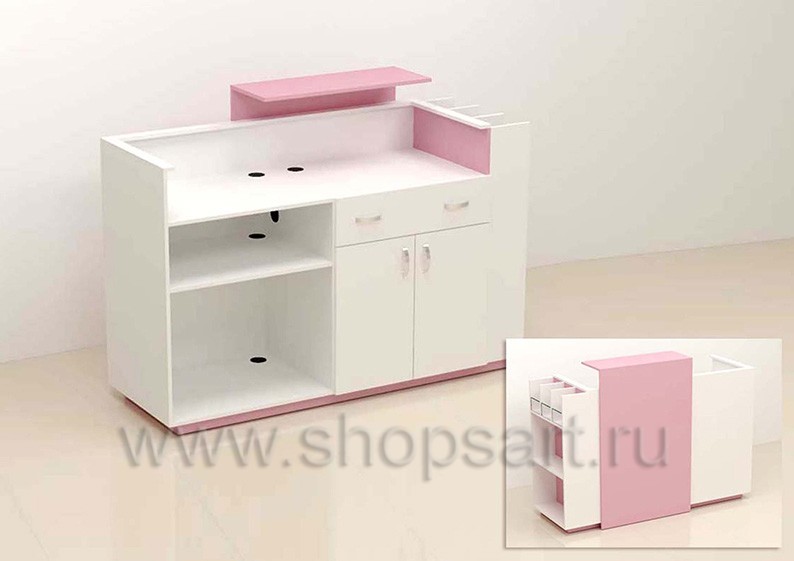 Кассовый стол с декоративной накладкой состоит из рабочего места продавца или кассира. Изделие выполнено с боковым, открытым торговым прилавком для сопутствующих товаров. Внутренне наполнение кассового стола состоит из открытой секции с полочками, укомплектовано ящиком, оснащенным выкатным механизмом полного выдвижения и тумбой с распашной дверкой для хранения товара или личных вещей. Изделие выполнено из белого и розового, матового ЛДСП 16 мм.
