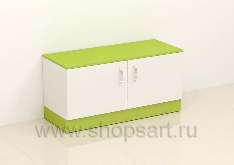 Накопитель с распашными дверками предназначен для хранения и сортировки товара, верхнюю часть накопителя дополнительно можно использовать для выкладки товара. Изделие предназначено для оформления пристенных торговых конструкций, устанавливается в нижней части блока торговых стеллажей. Каркас накопителя выполнен из белого, матового ЛДСП 16 мм. Верхняя крышка и цоколь выполнены из ЛДСП 16 мм, цвет «Зелёный лайм».
