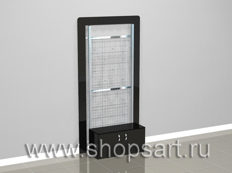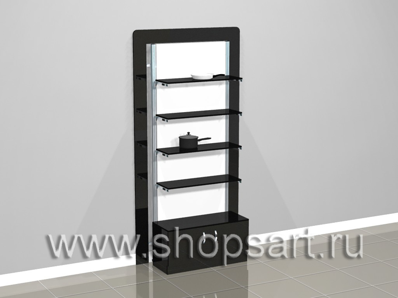 Стеллаж на базе перфорированной стойки 40х40х2400мм (хром). Комплектация: полки 900х350х16мм (МДФ суперглянец) на полкодержателях 300мм (хром), задние панели из ЛДСП, накопитель 1000х500х400мм. с распашными дверками (МДФ суперглянец). Стеллаж пристенный может комплектоваться полками из ЛДСП, МДФ, стекла различной глубины, перфорированными стойками любой модификации. Стойки могут оснащаться любыми кронштейнами (ширина: 600мм., 900мм., 1200мм.) и аксессуарами для навески и выкладки товара. Цоколь подиумов или накопителей можно изготовить из металлизированного пластика.