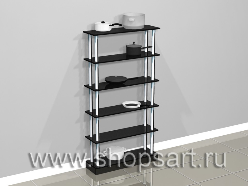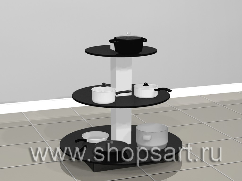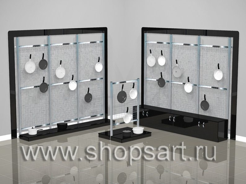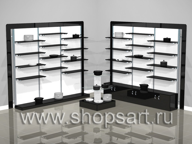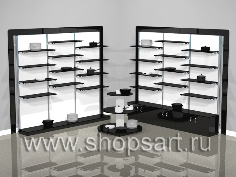 Коллекция “МЕБЕЛЬ ДЛЯ ПОСУДЫ”. Торговое оборудование для продажи посуды создано в контрастной цветовой гамме. Белый и черный цвета, всегда выгодно смотрятся и подчеркивают предметы, которые на них демонстрируются. Стеллажи и торговое оборудование этой коллекции может использоваться для демонстрации любого рода посуды: кастрюли, сковородки, аксессуары для кухни, мелкая бытовая техника, тарелки, чашки, столовые приборы. Посуда из нержавеющей стали будет эффектно смотреться на глянцевой черной или белой поверхности полок. Конструкция стеллажей очень удобна в эксплуатации, ее можно использовать не только в торговом пространстве магазина, а так же, и, как торгово-выставочное оборудование на выставках. Торговые стеллажи легко собираются и разбираются, не требуют крепления к стене, так как стоят на опорах. В нижней части стеллажей можно использовать закрытые накопители или подиумы для выкладки крупногабаритных товаров. Островные элементы органично впишутся в Ваш интерьер, и могут использоваться как островки для демонстрации брендового товара, новых коллекций или распродажи.