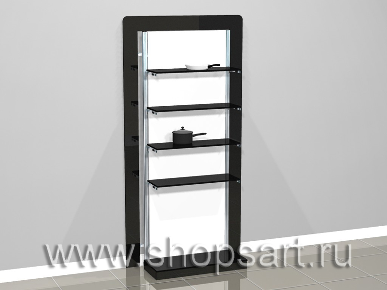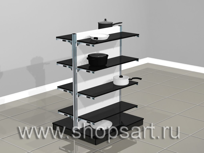 Используется для выкладки посуды и других товаров. Одна из основных стоек в магазинах самообслуживания. Устанавливается в центре зала или вдоль стеклянной стены (витрины). Стойка островная (1900х1000х300хмм), на базе металлических хромированных труб, подиум 1000х300х100мм (МДФ суперглянец), полки стекло 8мм. Стойка может комплектоваться полками из ЛДСП, МДФ, стекло. Габариты стойки можно изменить. Цоколь подиума можно изготовить из металлизированного пластика. Данная стойка имеет хромированные трубы и полки из ЛДСП или высокоглянцевого МДФ.