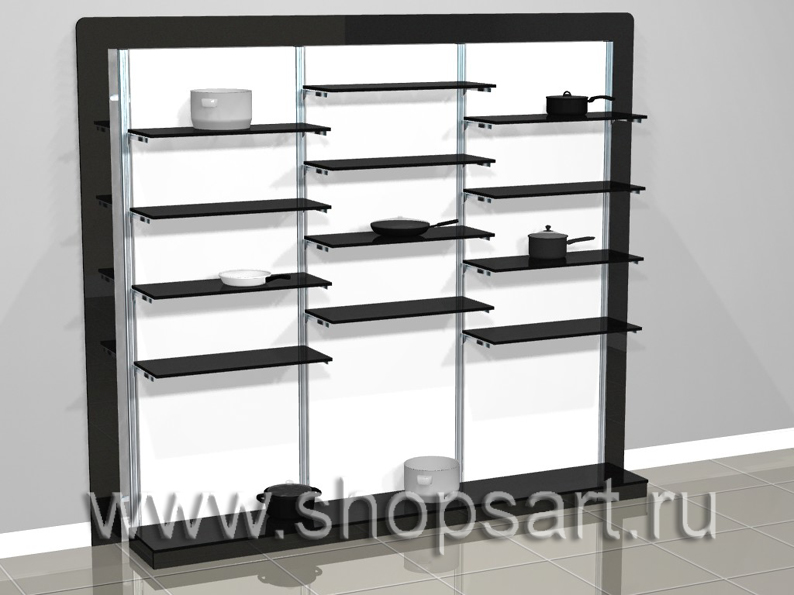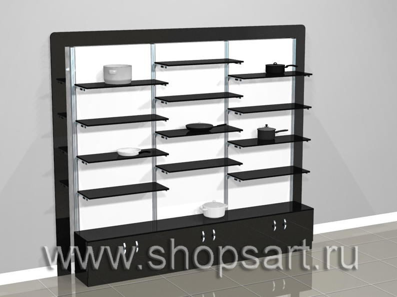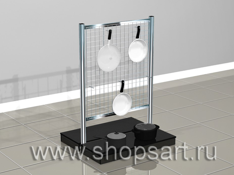 В изделии используются: стойки перфорированные 40х40х2400мм (хром); решетка 2000х800мм., подиум 800х400х100мм (МДФ суперглянец). Стеллаж на опорах, не требует крепления к стене. Стеллаж пристенный используется для выкладки и навески посуды, сковородок, аксессуаров для кухни и других товаров. Стеллаж пристенный может комплектоваться полками из ЛДСП, МДФ, стекла различной глубины, перфорированными стойками любой модификации. Стойки могут оснащаться любыми кронштейнами (ширина: 600мм., 900мм., 1200мм) и аксессуарами для навески и выкладки. Цоколь подиумов или накопителей можно изготовить из металлизированного пластика.