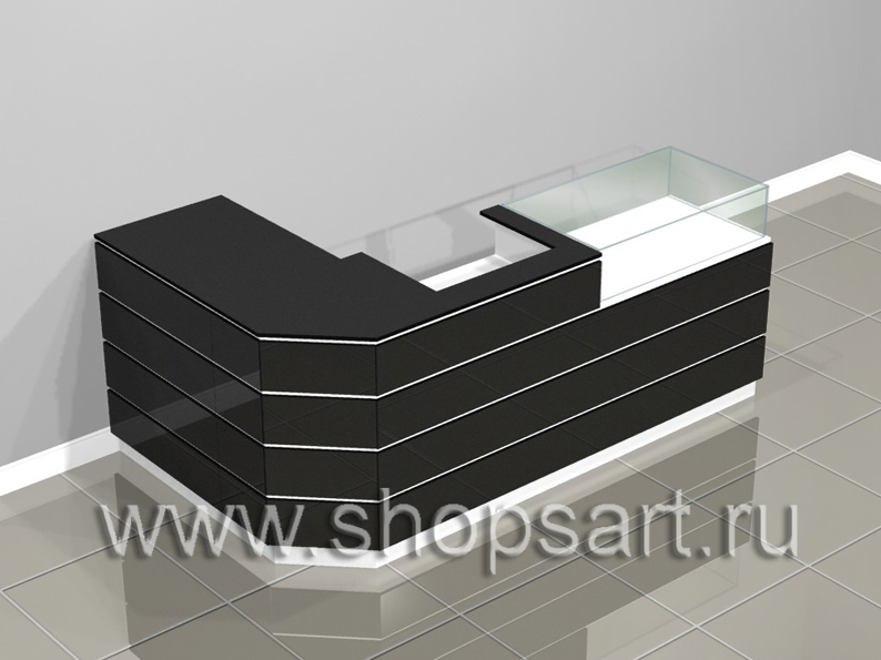 Состоит из 4-х элементов — глухие прилавки, кассовый прилавок и прилавок со стеклянным колпаком для выкладки и демонстрации товара. Кассовый узел изготовлен из комбинированного материала: основание, (корпус) из ЛДСП, полосы из МДФ суперглянец. Наполнение прилавков может быть разным — распашные дверки, выдвижные ящики, каретки и т.д.