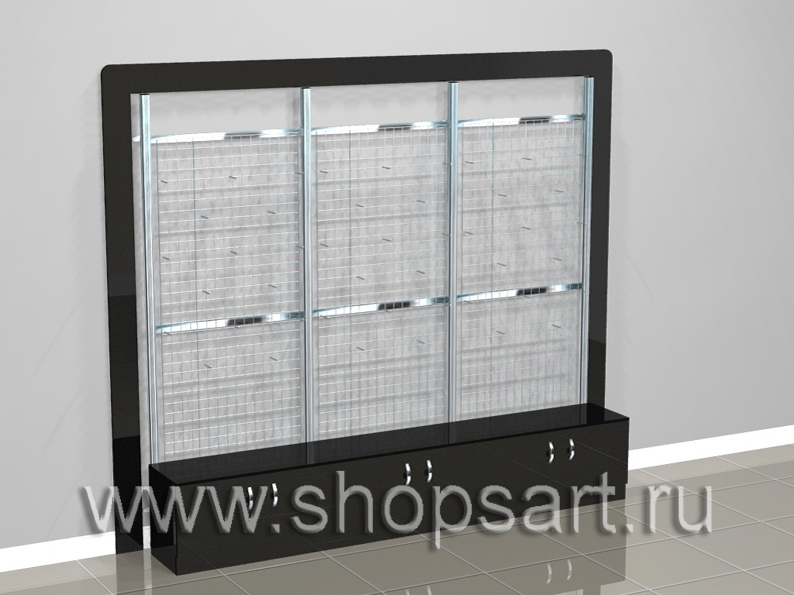 Стеллажи пристенные на базе перфорированной стойки 40х40х2400мм (хром). Комплектация: задние стенки из ЛДСП, накопители 900х500х400мм. с распашными дверками (МДФ суперглянец), подиумы 900х400х100мм (МДФ суперглянец), рамки 150мм. (МДФ суперглянец). Полки (МДФ суперглянец) на полкодержателях 300мм. (хром). Стойки перфорированные на опорах, не требуют крепления к стене. Размер блока 3130х2600х500мм. В нижней части стеллажей устанавливаются подиумы для выкладки крупногабаритных товаров.