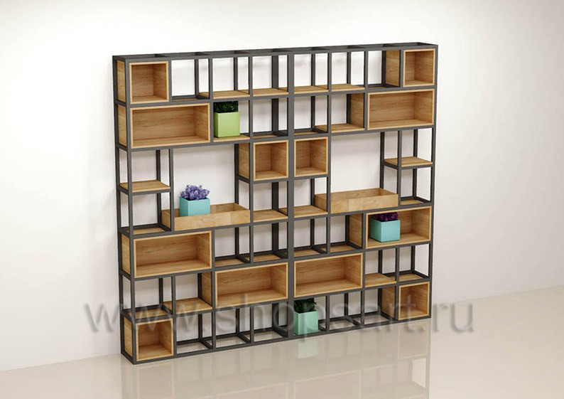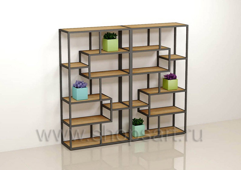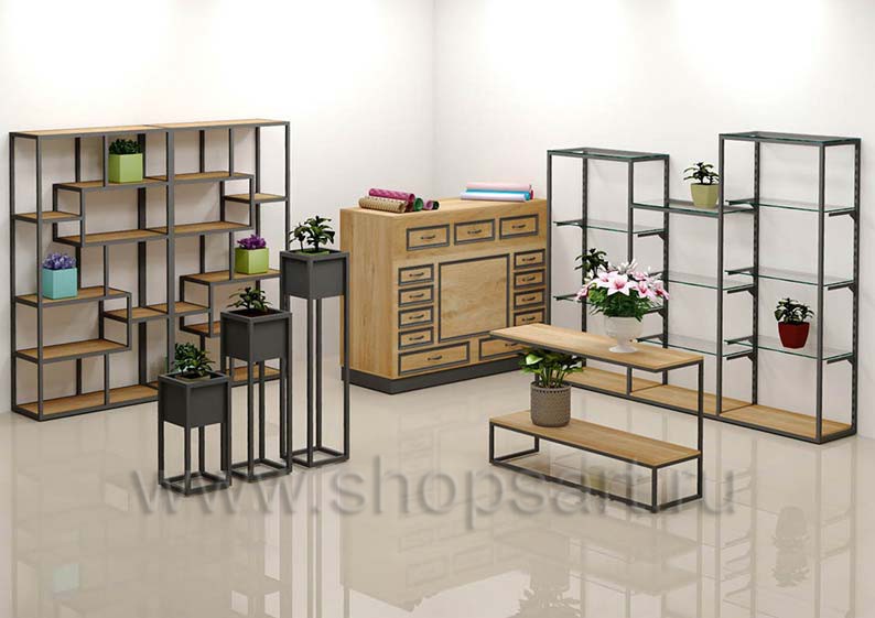 Оборудование для цветочного магазина в виде блока торговых, пристенных стеллажей имеет открытую конструкцию для выкладки товара, предназначен для демонстрации растений в горшках, ваз для букетов или книг по уходу или выращиванию растений. Каркас изделия имеет в своей основе цельносварную металлическую конструкций из квадратной трубы 25×25 мм с покрытием порошковой краской чёрного, матового цвета. Кубы, полочки и ящики для выкладки товара изготовлены из матового ЛДСП 16 мм.