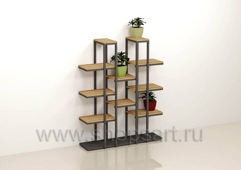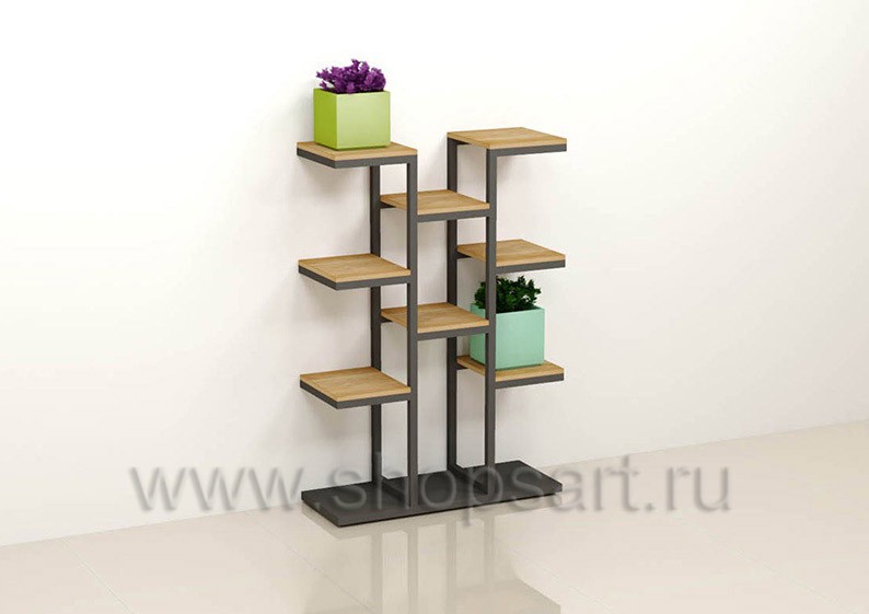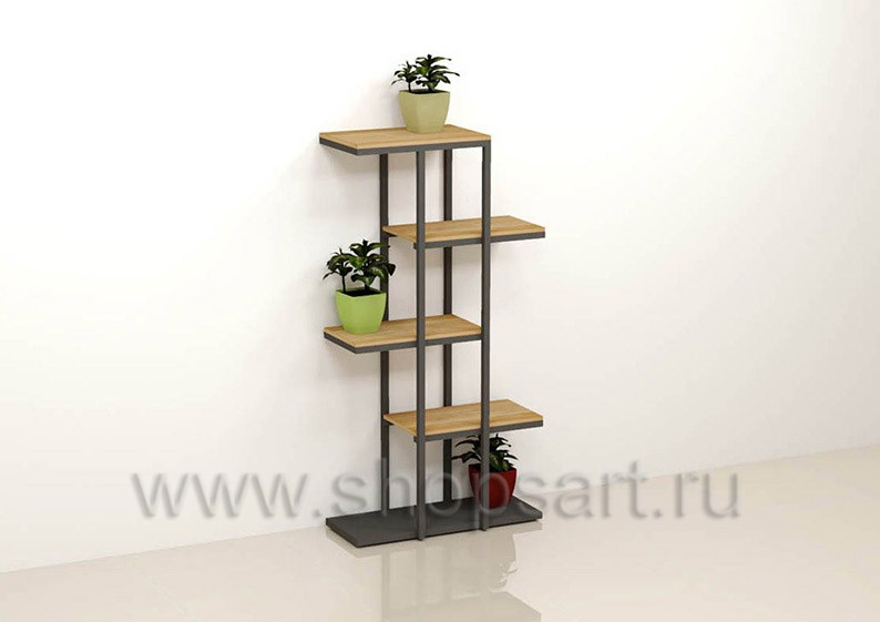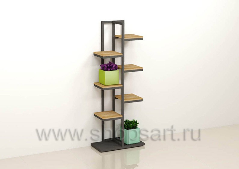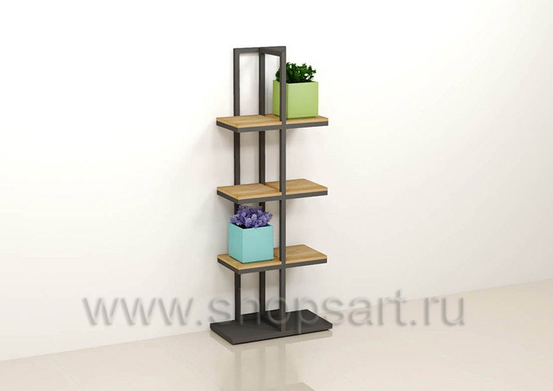 Стойка напольная для цветов предназначена для оформления торговых витрин магазина, пристенных торговых конструкций или для создания островных композиций в центре торгового зала. Каркас изготавливается из цельносварной металлической, квадратной трубы 25X25 мм с покрытием порошковой краской чёрного, матового цвета. Полочки для демонстрации товара выполнены из матового ЛДСП 16 мм. По желанию заказчика торговая стойка может быть выполнена в любом, другом цвете материалов и габаритных размерах.