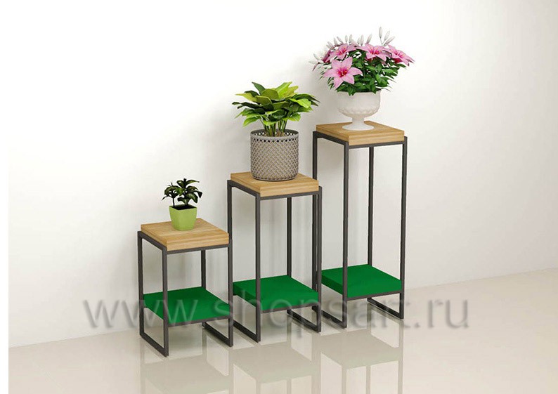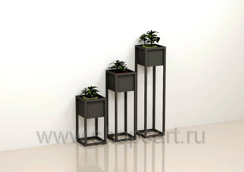 Комплект торговых стоек предназначен для демонстрации горшечных растений, состоит из трех отдельно стоящих демонстрационных стоек, подойдет для оформления торговых витрин магазина цветов или островных конструкций в торговом зале. Каркас изделий выполнен из цельносварной металлической трубы 25х25 мм с покрытием порошковой краской чёрного, матового цвета. Для выкладки товара устанавливаются ящики, выполненные из матового ЛДСП 16 мм. По желанию заказчика изделие может быть выполнено в другом цвете материалов.