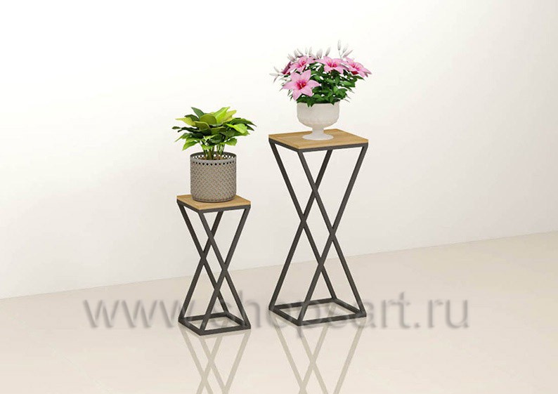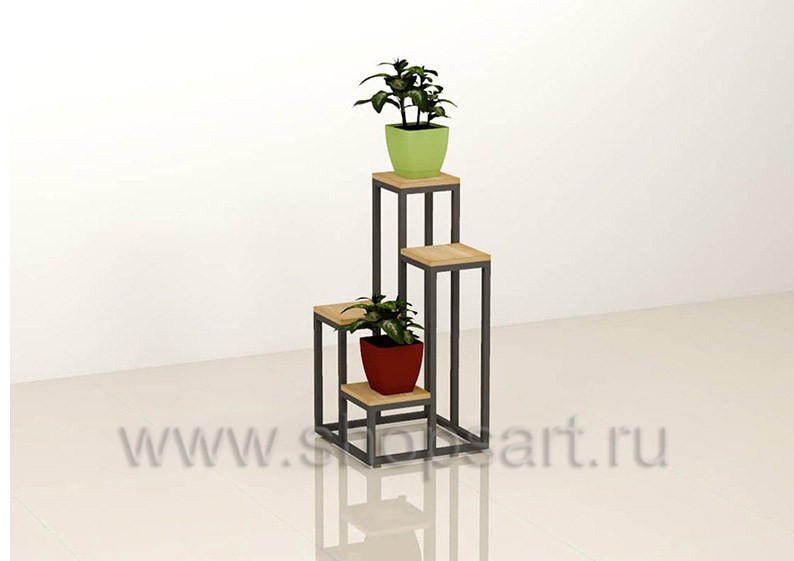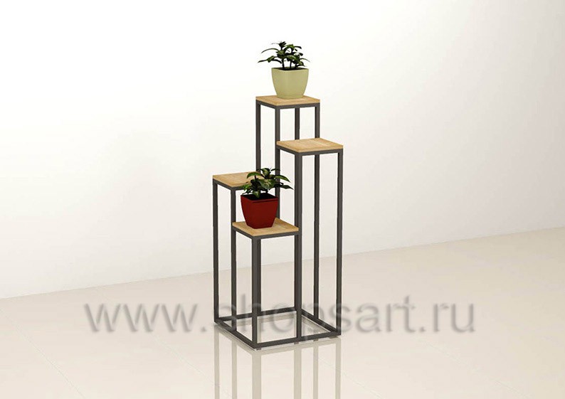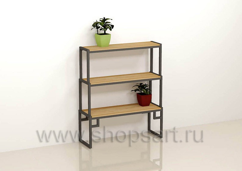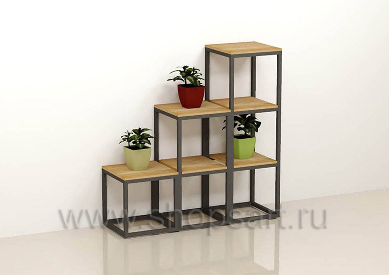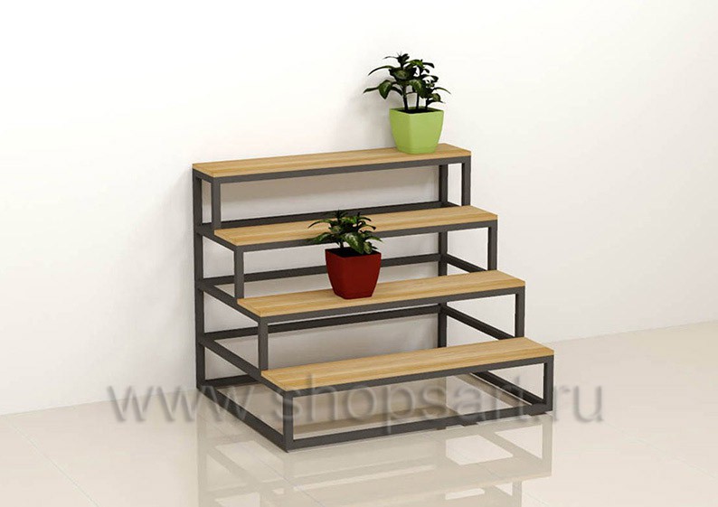 Подставка для цветочного магазина предназначена для демонстрации горшечных растений, небольших букетов из свежих цветов, подойдет для оформления пристенных торговых конструкций в магазине или салоне цветов. Каркас изделия выполнен из цельносварной металлической трубы 25×25 мм с покрытием порошковой краской чёрного, матового цвета. Полочки для выкладки товара выполнены из матового ЛДСП 16 мм.
