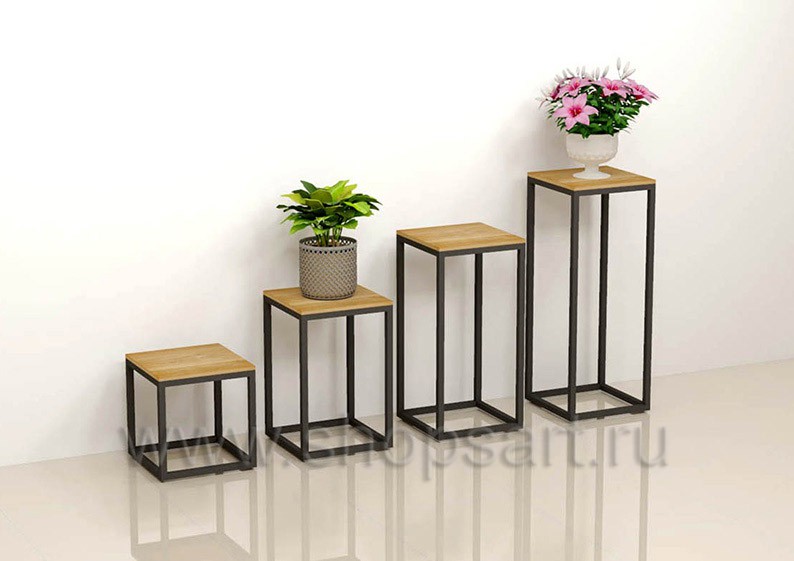 Комплект напольных стоек для растений предназначен для оформления торговых витрин магазина или для создания островных композиций в центре торгового зала. Комплект торговых стоек подойдет для демонстрации растений в горшках, небольших композиций букетов или подарочных корзин из живых цветов. Каркас торговых стоек выполнен из металлической квадратной трубы 25×25мм с покрытием порошковой краской чёрного, матового цвета. Полочки для выкладки товара выполнены из матового ЛДСП 32 мм.