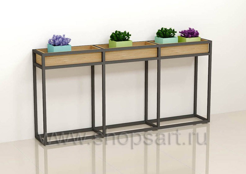 Консоль торговая состоит из трех открытых секций с ящиками для демонстрации растений, подойдет для оформления пристенных и островных конструкций или торговой витрины магазина цветов. Каркас изделия выполнен из металлической квадратной трубы 25×25 мм с покрытием порошковой краской чёрного, матового цвета. Ящики выполнены из матового ЛДСП 16 мм. По желанию заказчика изделие может быть выполнено в любом, другом цвете материалов и габаритных размеров.