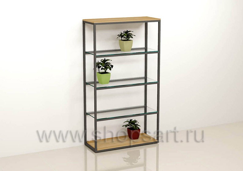 Стеллаж со стеклянными полками предназначен для демонстрации растений в горшках, подойдет для оформления пристенных торговых конструкций в магазине или для оформления торговой витрины. Каркас изделия выполнен из металлической квадратной трубы 25×25 мм с покрытием порошковой краской чёрного, матового цвета. Полки для выкладки товара выполнены из бесцветного стекла 8 мм. В нижней и верхней части пристенного стеллажа установлены полки из матового ЛДСП 16 мм.