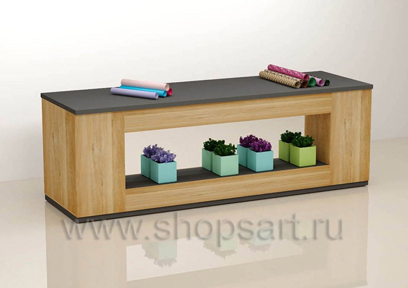 Флористический стол разработан специально для цветочного магазина, оформлен декоративной рустовкой. Столешница изделия выполнена из влагостойкой плиты темно-серого, матового цвета. По согласованию с заказчиком столешница может быть выполнена из искусственного камня. Внутренне наполнение стола имеет открытую конструкцию с полками и выдвижным ящиком для принадлежностей, необходимых в работе.