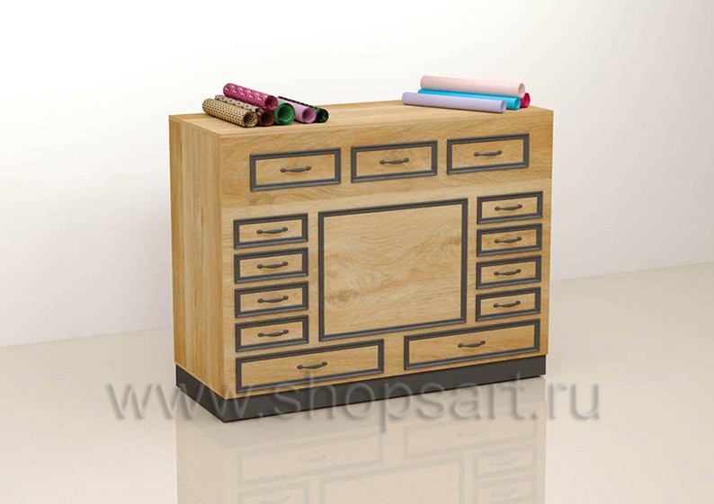 Кассовый стол — необходимое торговое оборудование для магазина, торгового павильона или салона цветов. Изделие выполнено из матового ЛДСП 16 мм, цвет «Дуб Сакраменто светлый». Фасад изделия оформлен декоративной отделкой с имитацией ящиков и ручек. По желанию заказчика кассовый стол может быть выполнен в другом цвете материалов и габаритах.
