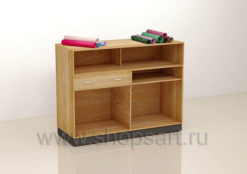 Стол кассира состоит из рабочего места продавца или флориста. Внутренне наполнение кассового стола укомплектовано ящиком, оснащенным выкатным механизмом полного выдвижения и открытыми полочками для хранения расходного материала и необходимых инструментов для работы. Изделие выполнено из матового ЛДСП 16 мм, цвет «Дуб Сакраменто светлый».