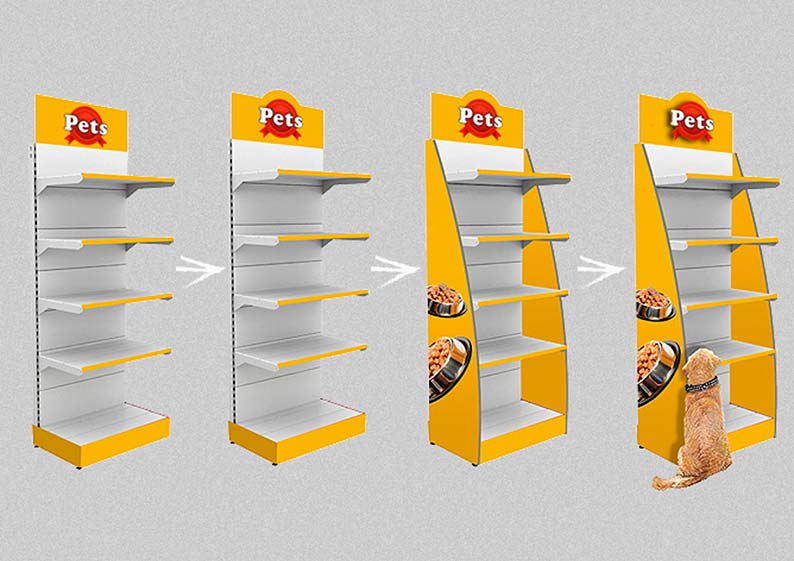 Торговый металлический стеллаж служит для выкладки и продажи корма для кошек и собак производителя питания для животных “Royal Canin”. Стеллаж состоит из задней стенки, на стойки которой навешиваются полки, подиума, лайтбокса и фигурных декоративных боковин. Стеллаж может поставляться с таким количеством полок, которое необходимо покупателю. Полки могут передвигаться по высоте на любой уровень. Лайтбокс оснащен светодиодной подсветкой. На цокольную планку наносится логотип компании.