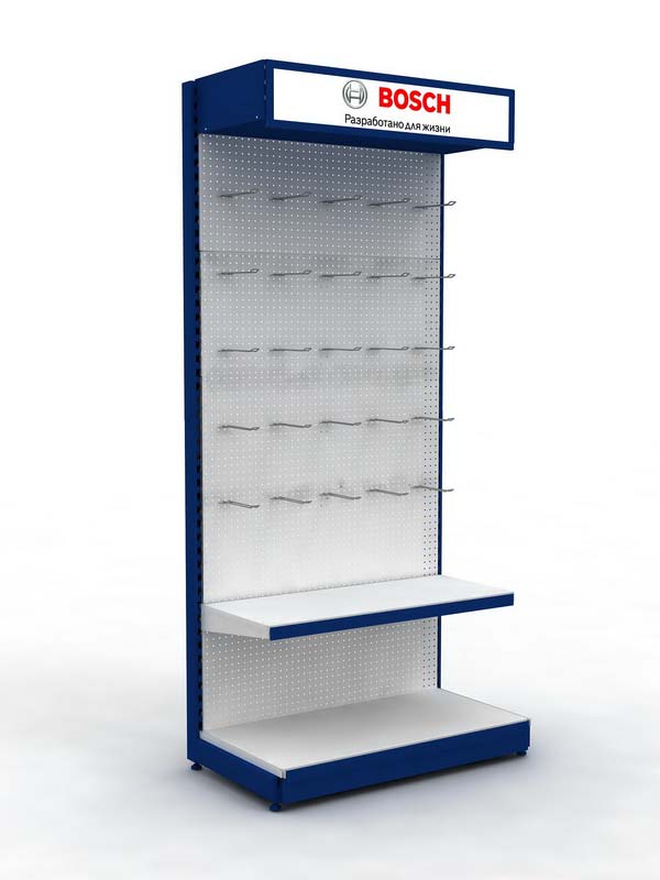 Торговый металлический стеллаж для магазинов служит для продажи продукции фирмы “BOSCH”. Устанавливается возле стены как отдельно стоящий, так и в линии подобных стеллажей. Брендовый стеллаж комплектуется задней перфорированной панелью с крючками и полками. Вверху фирменного стеллажа монтируется световой короб со светодиодными светильниками для освещения товара. Логотип компании на световом коробе имеет свою подсветку.