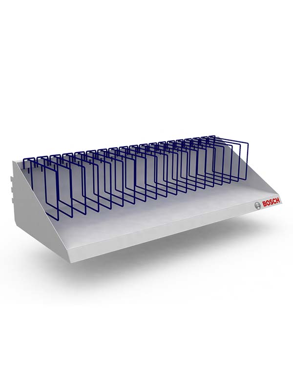 Торговая пока служит для выкладки и продажи продукции фирмы “BOSCH”. Навешивается на торговые металлические стеллажи. Оптимально подходит для выкладки шлифовальных и отрезных дисков, товаров в плоских упаковках и другой расходной продукции. Полка содержит проволочные съемные перегородки, которые позволяют разделять продукцию по группам и ассортименту. В торговом стеллаже возможно расположить одну или несколько подобных полок.