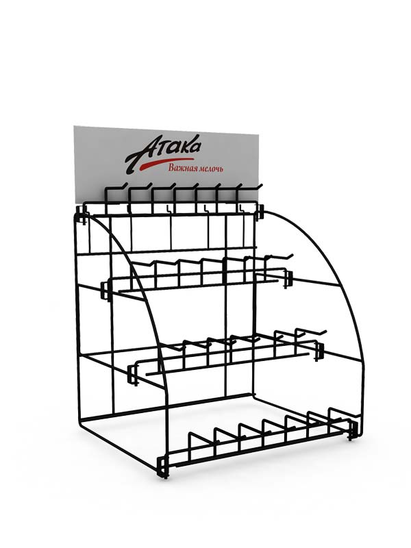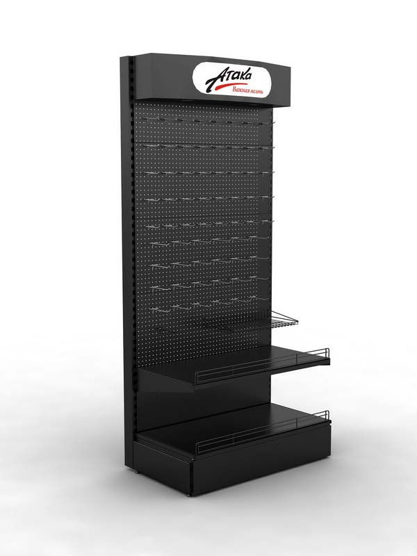Торговый металлический стеллаж служит для выкладки и продажи расходного обеспечения фирмы “АТАКА” для инструмента. Стеллаж состоит из перфорированной задней стенки, подиума, полки и лайтбокса. На задней стенке возможно разместить разнообразные навесные элементы: сетчатые корзины, крючки, различные держатели из проволоки. Лайтбокс оснащен светодиодными светильниками для подсветки товара на стеллаже и фирменного логотипа компании.