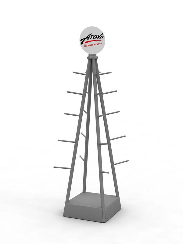 Брендированная металлическая стойка служит для навески и продажи продукции компании “Атака”. Эта стойка специально проектировалась для демонстрации круглых шлифовальных дисков и отрезных кругов. Товар на этой стойке расположен с четырех сторон, что позволяет произвести вывеску разных размеров и ассортимента продукции в наиболее максимальном количестве. В то же время подобное расположение товара удобно и для покупателя, делающего свой выбор.