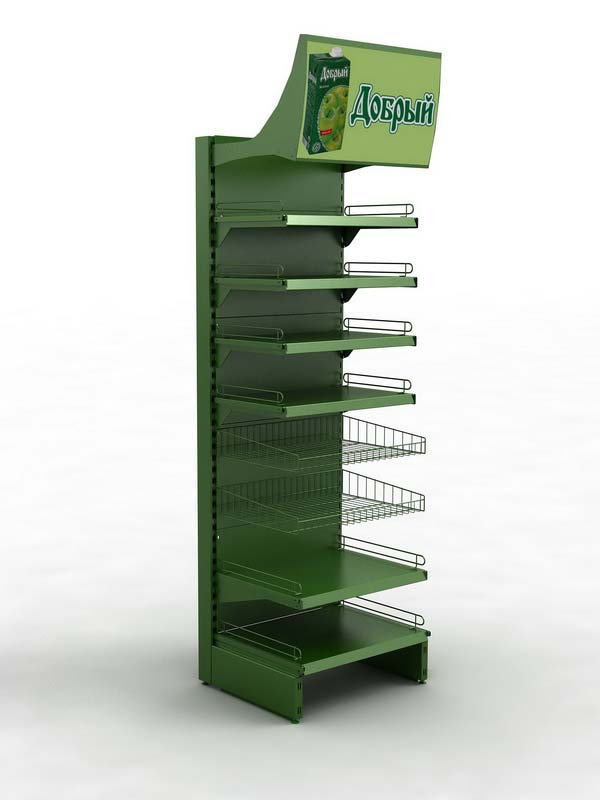 Торговый металлический стеллаж служит для выкладки и продажи соков торговой марки “Добрый”. Стеллаж комплектуется сетчатыми корзинами и полками с боковыми ограничителями. Вверху стеллажа монтируется козырек с брендом компании. По желанию заказчика возможна установка светового короба. Брендовый стеллаж окрашен в фирменный цвет торговой марки компании.