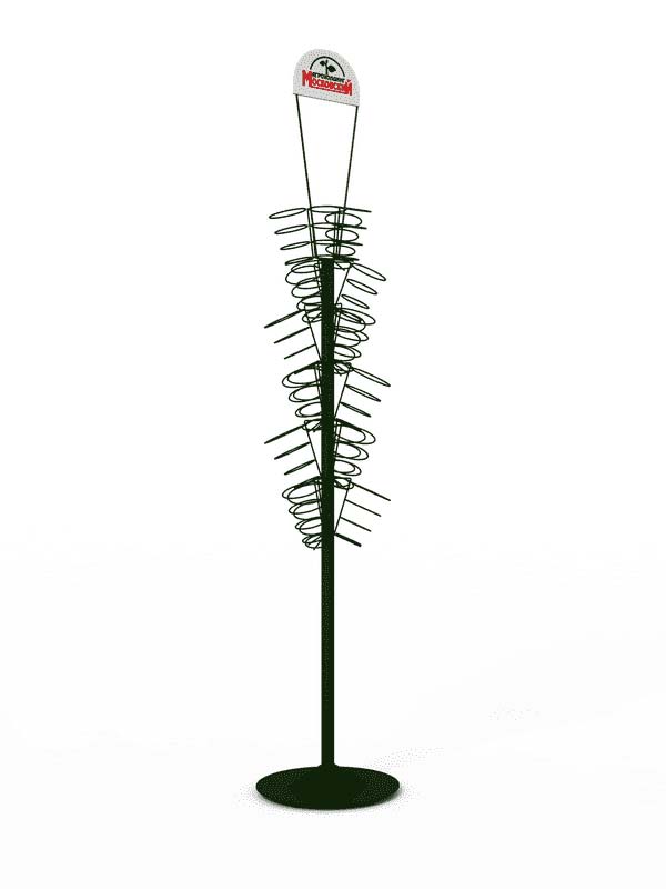 Торговая металлическая вращающаяся стойка служит для демонстрации и продажи рулеток для собак немецкого производителя “Flexi”. В основании стойки установлены вращающиеся диски, которые позволяют покупателю осмотреть все изделия поворачивая стойку вокруг своей оси. Стойка комплектуется крючками для вывешивания товара. Стойка удобна еще тем, что может передвигаться по торговому залу благодаря колесикам, смонтированным на нижнем диске. Стойка может иметь двухстороннюю, трехстороннюю и четырехстороннюю конфигурацию. В верхней части установлены логотипы компании.