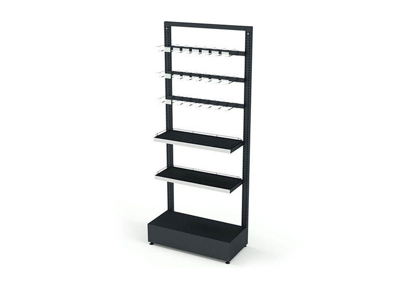 Торговый стеллаж для демонстрации товара имеет открытую конструкцию, внизу установлен подиум. Пристенный стеллаж оснащен навесными крючками для вывешаемого товара и полками для демонстрации и выкладки продукции. На полках устанавливаются ограничители и ценникодержатели. Полки регулируются по высоте.