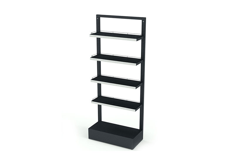 Торговый стеллаж для демонстрации товара имеет открытую конструкцию, внизу установлен подиум. Пристенный стеллаж оснащен полками для демонстрации и выкладки товара. На полках устанавливаются ограничители и ценникодержатели. Полки регулируются по высоте. Цвет окраски стеллажа и конструктив может быть любым.