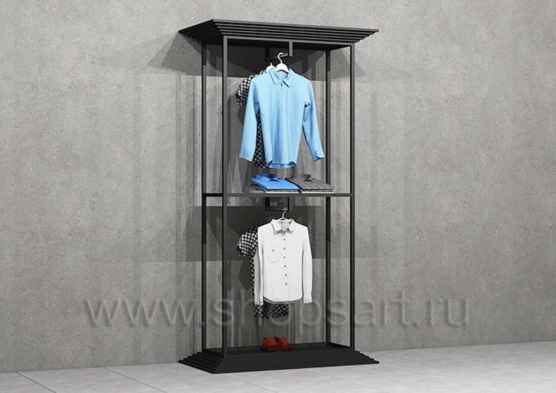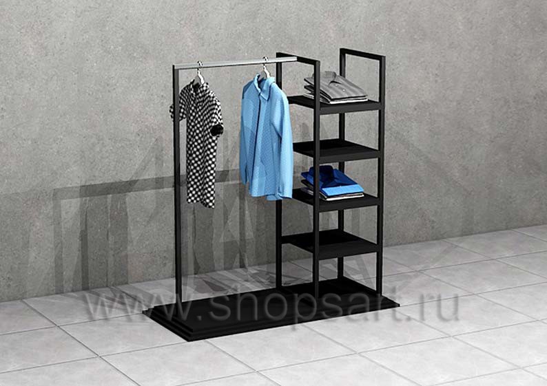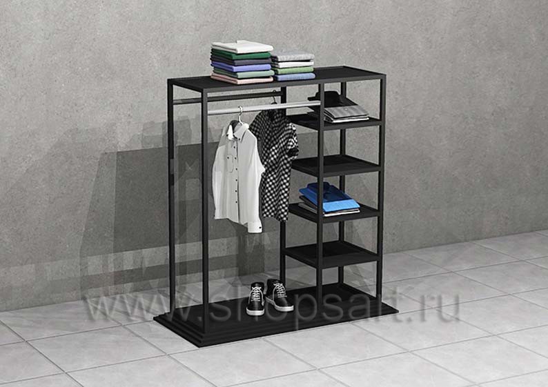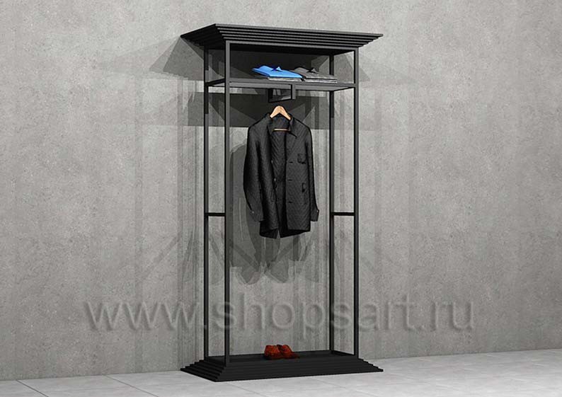 Стойка островная, в стиле ЛОФТ, используется для демонстрации мужской одежды и состоит из секции со штангой для навески одежды, и секции с полочками для выкладки товара. Каркас островной стойки изготавливается из сварной квадратной трубы 25х25 мм. с покрытием порошковой краской чёрного, матового цвета. Полочки изготавливаются из черного, матового ЛДСП 16 мм. В нижней части стойки устанавливается декоративный, классический подиум для демонстрации обуви или аксессуаров.