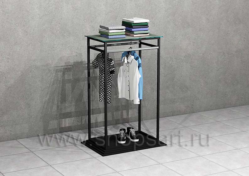 ЛОФТ стойка торговая, островная предназначена для демонстрации одежды в центре торгового зала. Торговая стойка для магазинов имеет в своей основе металлическую сварную квадратную трубу 25х25мм. с покрытием порошковой краской черного, матового цвета. В верхней части стойки устанавливается полочка из стекла 8 мм, которую можно использовать для выкладки одежды из трикотажа или аксессуаров.