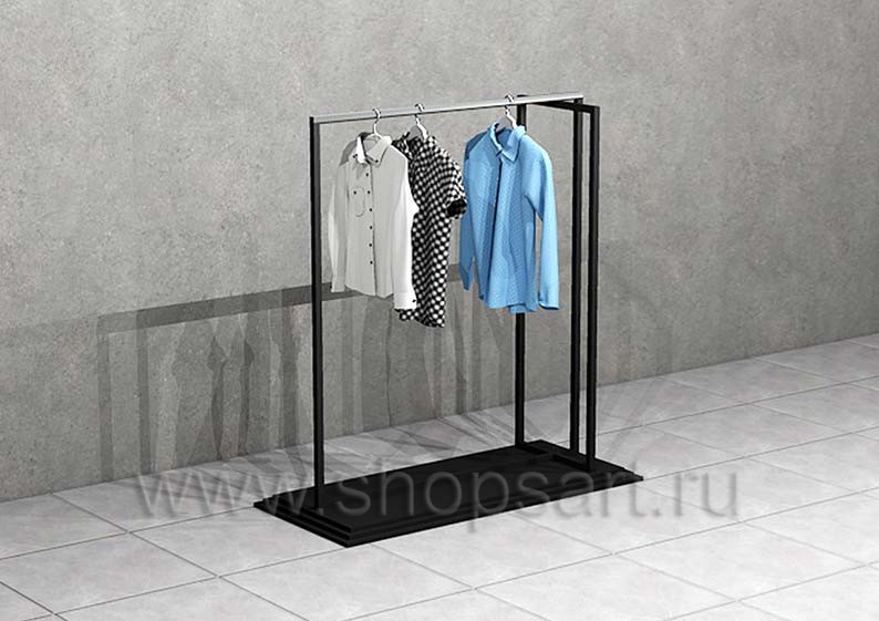 Вешало в стиле ЛОФТ, островное, с одноярусной штангой для демонстрации одежды, устанавливается в центре торгового зала, идеально впишется в любой интерьер. В нижней части вешала устанавливается декоративный классический подиум для демонстрации обуви или аксессуаров. Имеет открытую конструкцию для демонстрации товара и удобный доступ к нему покупателям. Торговое вешало для магазинов имеет в своей основе металлическую сварную квадратную трубу 25х25мм. с покрытием порошковой краской черного, матового цвета.