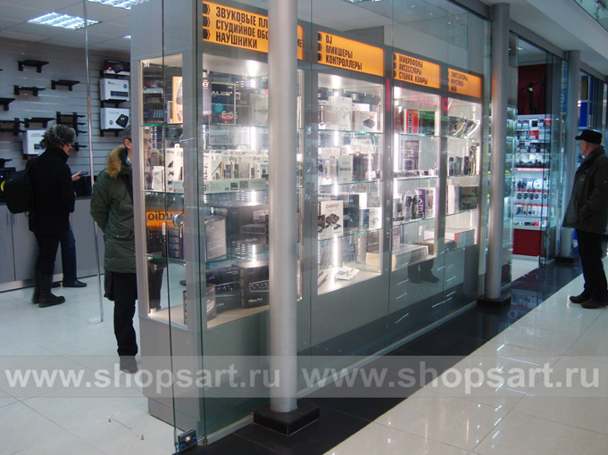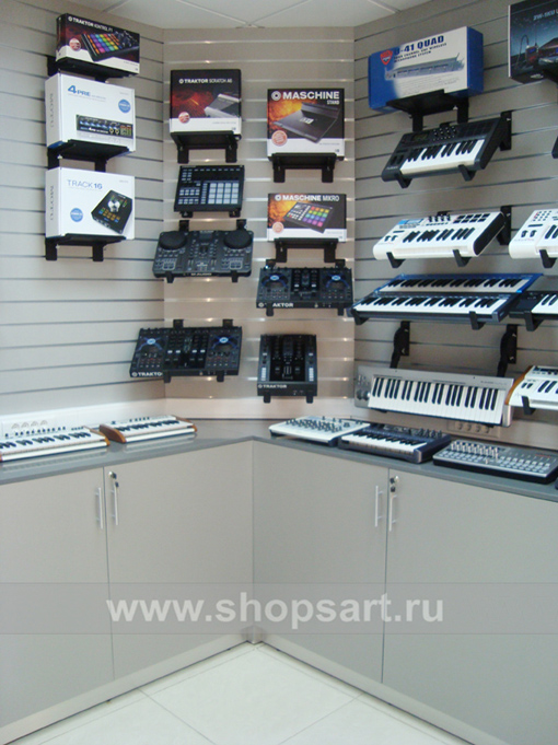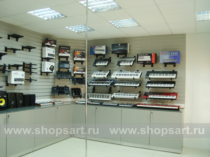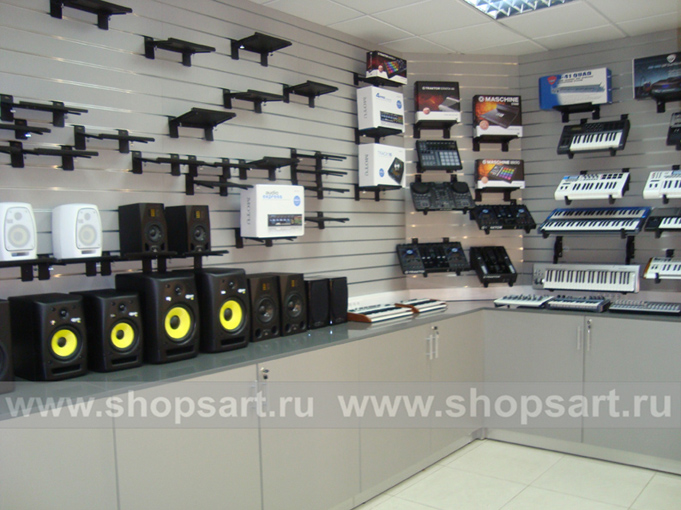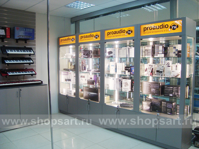 На этой странице Вы можете ознакомиться с фотографиями торгового оборудования в открытом магазине для музыкантов «Proaudio», находящемся в городе Москве. Произвела, поставила и установила в магазине торговую мебель: торговые стеллажи, торговые прилавки, торговые острова, торговые стойки, пристенные стеллажи, торговые шкафы и др. компания ООО «Искусство интерьеров»
