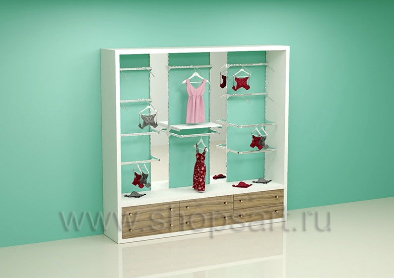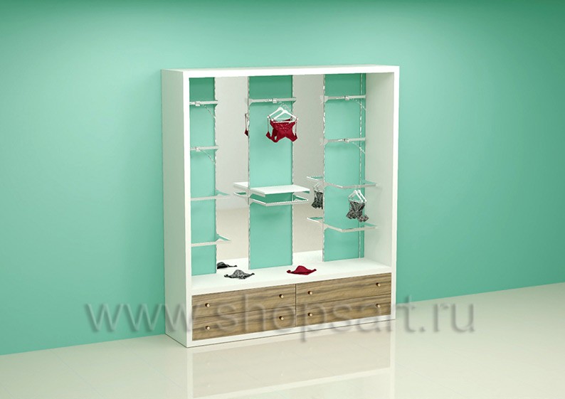 Стеллаж торговый, пристенный предназначен для демонстрации нижнего белья. Каркас изделия выполнен из белого, матового ЛДСП 16 мм. Задняя стенка стеллажа имеет декоративные вставки из зеркала, которые придают данному изделию лоск и глянец, позволяя тем самым привлекать внимание покупателей к товару. Стеллаж укомплектован «П»-образными и фронтальными кронштейнами белого, матового цвета регулируемыми по высоте. В нижней части установлены накопители с выдвижными ящиками для хранения товара. Изделие может быть выполнено в любом, другом цвете материалов.