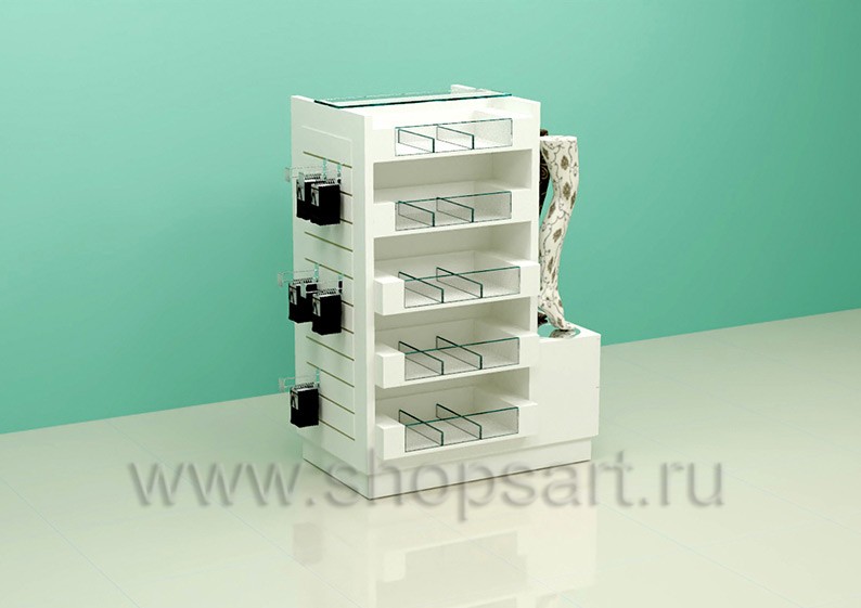 Стойка островная выполнена из белого, матового ЛДСП 16 мм. Для сортировки и демонстрации колготок установлены ячейки с разделителями, имеющие прозрачную переднюю стенку, которые служат для эффективной демонстрации образцов белья, чулок, колготок. С боковой стороны стойки устанавливается эконом панель для демонстрации мелкогабаритной продукции и накопитель с выдвижными ящиками для сортировки и хранения запасного товара.