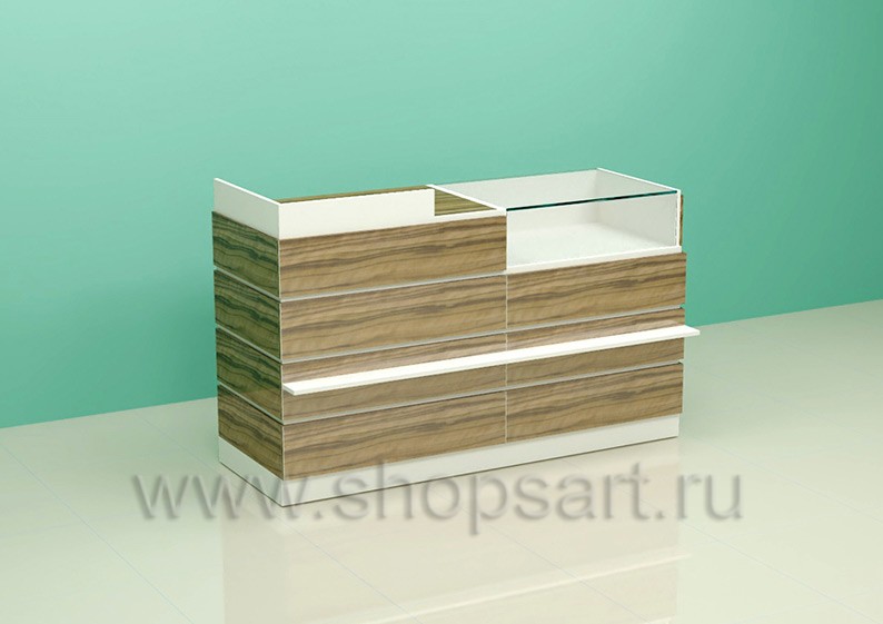 Кассовый стол состоит из рабочего места продавца и стеклянного прилавка для аксессуаров. Каркас кассового стола выполнен из белого, матового ЛДСП 16 мм с декоративной отделкой из высокоглянцевого МДФ, цвет «под дерево». Внутреннее наполнение кассового стола может быть разным: распашные дверки, выдвижные ящики, расположение и количество полок и т.д. Изделие может быть выполнено в любом, другом цвете материалов.