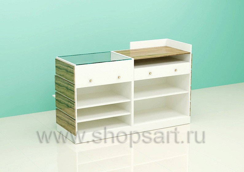 Стол для кассы состоит из двух секций: кассовый прилавок и стеклянного прилавка для демонстрации аксессуаров. Изделие выполнено из комбинированного материала: каркас и основание из белого, матового ЛДСП 16 мм, декоративная рустовка из высокоглянцевого МДФ цветом «под дерево». Внутреннее наполнение кассового стола имеет открытую конструкцию с полочками, оснащено выдвижными ящиками на направляющих полного выдвижения.