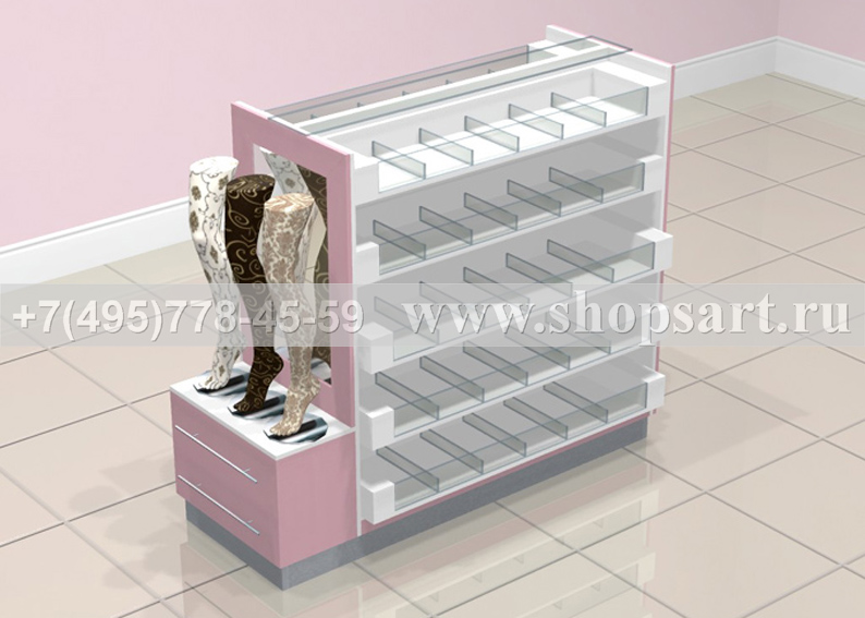 Стойка торговая, островная используется для выкладки и продажи колготок. Одна из основных стоек в магазинах самообслуживания. Устанавливается в центре зала. Стойка островная производится из ЛДСП. Ячейки для колготок изготовлены из прозрачного стекла. Ячейки в стойке — выдвижные. На боковых частях стойки располагаются экономпанель и зеркало, обрамленные рамкой из розового ЛДСП. В нижней части находится накопитель размером 400(h)х600х300мм. изготовленный из ЛДСП, с выдвижными ящиками на направляющих полного выдвижения. Цоколь островной стойки можно изготовить из металлизированного пластика. В верхней части стойки находится полка из стекла 8мм. Стойка очень вместительна, идеально подходит для продажи колготок. Вместо зеркала, на боковой части торговой стойки, можно установить манекен ноги женской для демонстрации колготок и чулок.