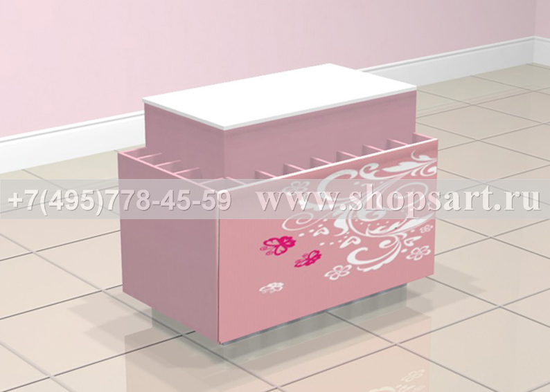 Стойка островная, торговая используется для выкладки и продажи колготок. Одна из основных стоек в магазинах самообслуживания. Устанавливается в центре зала. Стойка островная изготовлена из ЛДСП. Ячейки изготовлены из прозрачного стекла. Ячейки для колготок выдвижные. На боковых частях стойки располагаются экономпанель и зеркало, обрамленные рамкой розового ЛДСП. В нижней части расположен накопитель размером 400(h)х600х300мм. изготовленный из ЛДСП, с выдвижными ящиками на направляющих полного выдвижения. Цоколь островной стойки можно изготовить из металлизированного пластика. В верхней части стойки находится полка из стекла 8мм. Стойка очень вместительная, идеально подходит для продажи колготок.