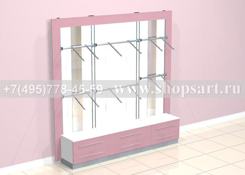 Стеллаж торговый, пристенный, используется для навески нижнего белья или одежды. В стеллажах использованы: стойки перфорированные 13х8х2250мм. или стойки 40х40х2400мм.; задние панели ЛДСП с зеркалами; накопители с выдвижными ящиками размером 500(h)х670/950х400мм.; кронштейны фронтальные 600мм., 900мм. или 1200мм., наклонные кронштейны, любые аксессуарами для навески и выкладки; полки из стекла, ЛДСП или МДФ различной глубины на полкодержателях; перфорированными стойками любой модификации. Перфорированные стойки могут устанавливаться на опоры и не нести нагрузку на стену, это важно для помещений, в которых не рекомендуется крепление к стене. Цоколь накопителей можно изготовить из металлизированного пластика.