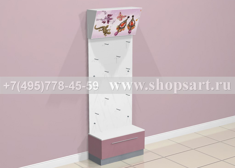 В верхней части торговых стеллажей располагаются световые короба с декоративным орнаментом или брендом товара. В нижней части расположены накопители с распашными дверками, или выдвижными ящиками. Настенные панели для бижутерии выполнены из белого глянцевого оргстекла с перфорацией. На панели для бижутерии устанавливаются прозрачные крючки из оргстекла. Стеллаж пристенный используется для выкладки и навески украшений и аксессуаров. Торговый стеллаж может комплектоваться полками, крючками любой длины. Цоколь накопителей можно изготовить из металлизированного пластика.