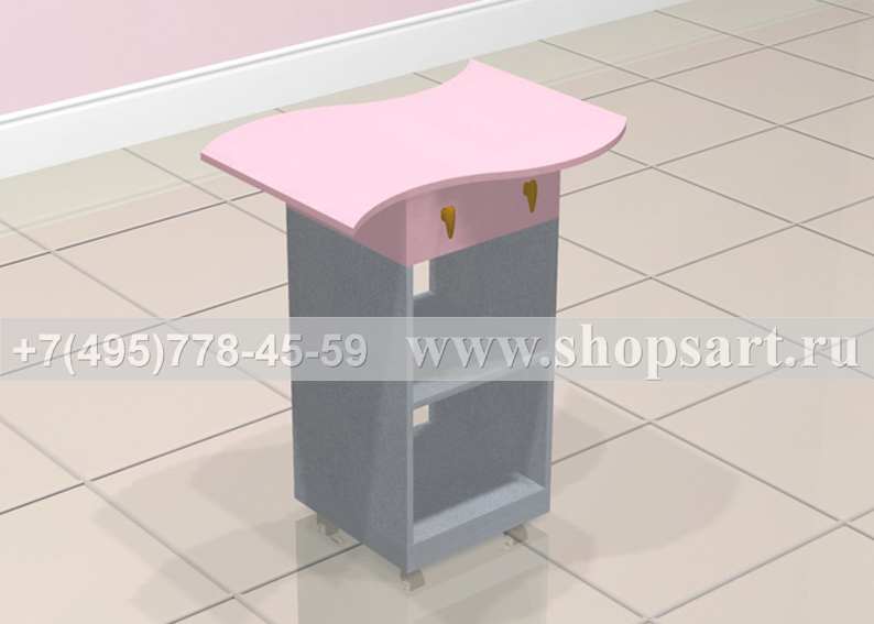 Стол упаковочный, с полками и выдвижным ящиком на направляющих полного выдвижения. Стол имеет в своем составе ячейки для упаковочной бумаги, что очень удобно для выбора покупателем подарочной упаковки. На фасаде упаковочного стола можно разместить логотип компании или декоративный орнамент. Цоколь стола можно изготовить из металлизированного пластика.