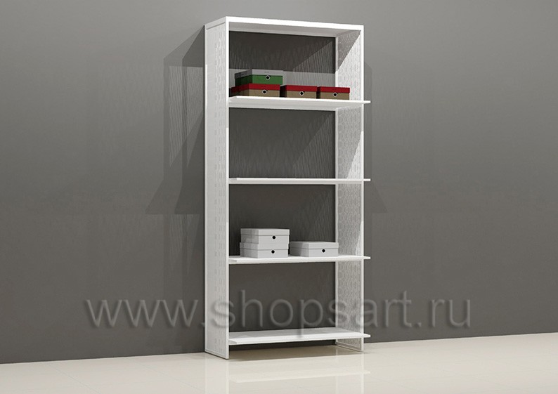 Стеллаж торговый, предназначен для демонстрации обуви. Пристенный стеллаж имеет в своей основе цельносварную конструкцию из металлической квадратной трубы 25×25 мм с покрытием порошковой краской белого, матового цвета. Боковые стенки изделия выполнены из сварной, металлической сетки. Габаритные размеры стеллажа и цвет окраски могут быть любыми, по согласованию с заказчиком.