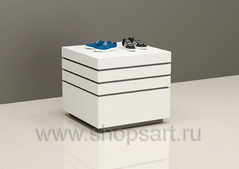 Подиум предназначен для оформления торговых витрин или островных конструкций в центре торгового зала для демонстрации обуви или сумок, поможет создать эксклюзивные островные конструкции в магазине или бутике небольшой площади. Изделие выполнено из комбинированного матового ЛДСП 16 мм.