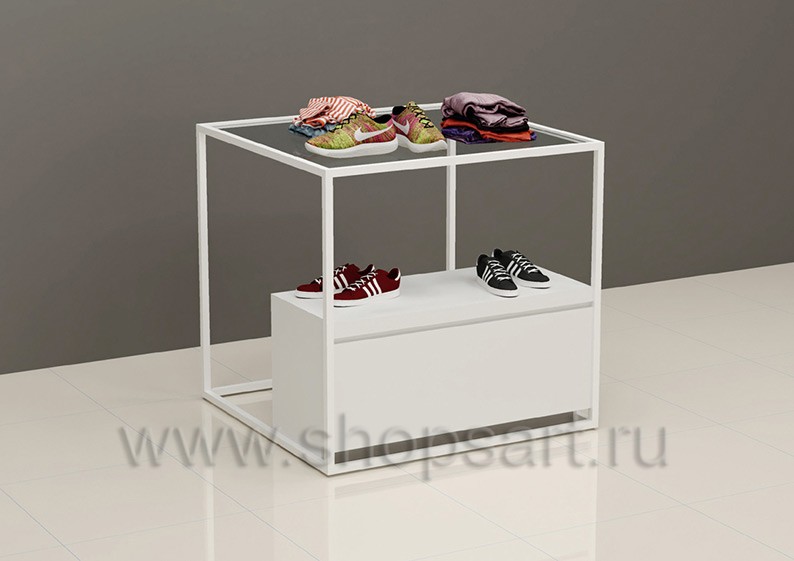 Островной стол с тумбой предназначен для демонстрации обуви или сумок. Каркас демонстрационного столика изготавливается из металлической квадратной трубы 25х25 мм с покрытием порошковой краской белого, матового цвета. В верхней части демонстрационного стола устанавливается стеклянная столешница. Демонстрационная тумба выполнена из белого, матового ЛДСП 16 мм или любого другого цвета.