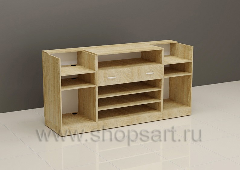 Кассовый стол — является обязательным элементом мебели в обустройстве торгового помещения магазина. Данная модель кассового стола рассчитана на два рабочих места, оснащена прилавком для упаковки товара. Внутреннее наполнение кассового стола состоит из открытых секций с полочками и выдвижного ящика на направляющих полного выдвижения. Изделие выполнено из матового ЛДСП 16 мм, цвет «под дерево». По желанию заказчика стол для кассы может быть выполненным в других габаритных размерах и любом другом цвете материалов.