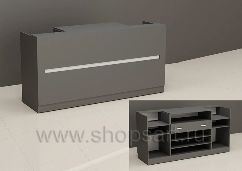 Кассовый стол с прилавком для упаковки покупок создан, для быстрого обслуживания покупателей, рассчитан на два рабочих места продавца и кассира. Место под кассовый аппарат располагается ниже основной столешницы. Изделие выполнено из чёрного, матового ЛДСП 16 мм. Внутреннее наполнение кассового стола состоит из открытых секций с полочками и выдвижного ящика на направляющих полного выдвижения или может быть изменено по согласованию с заказчиком.