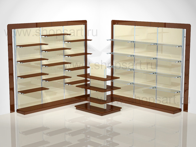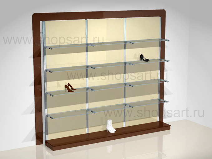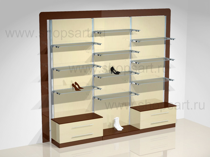 Стеллажи пристенные из 3-х модулей обрамляет декоративная рама, которая позволяет выделить торговую зону в магазине и привлечь внимание покупателей к товару, выложенному на стеллажах. Торговые стеллажи имеют в своем составе: стеклянные полки 8 мм. на полкодержателях 300мм. (хром); перфорированные стойки на опорах, возможны стойки с креплением к стене; задние панели из ЛДСП; подиумы из высокоглянцевого МДФ. В нижней части стеллажей устанавливаются подиумы, которые можно использовать для выкладки высокой обуви.Подробнее
