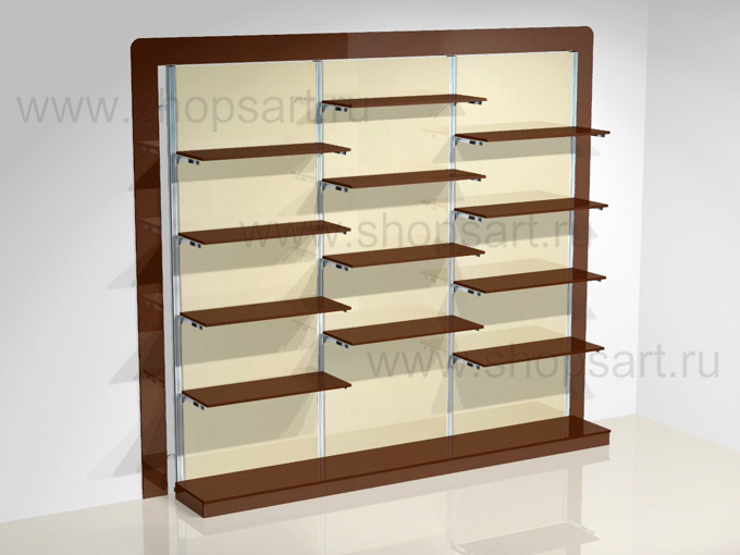 Торговое оборудование из 3-х модулей пристенных стеллажей обрамляет декоративная рама, которая позволяет выделить торговую зону в магазине и привлечь внимание покупателей к товару, выложенному на стеллажах. Торговые стеллажи имеют в своем составе: стеклянные полки 8 мм. на полкодержателях 300мм. (хром); глянцевые полки на полкодержателях 300мм. (хром); перфорированные стойки на опорах, возможны стойки с креплением к стене; задние панели из ЛДСП; подиумы из высокоглянцевого МДФ. Одна из основных стоек в магазинах самообслуживания.Подробнее