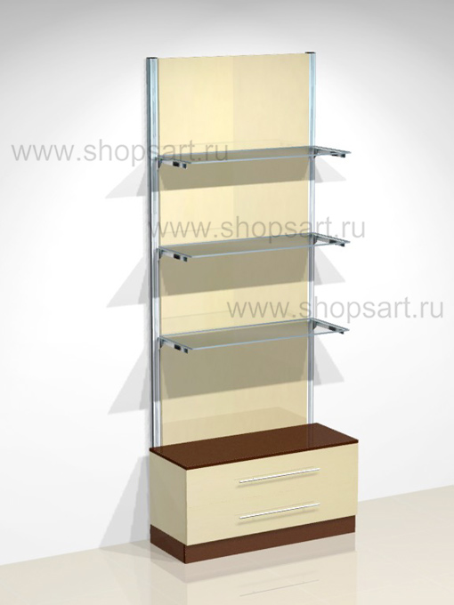 Стеллаж пристенный используется для демонстрации обуви. Торговый стеллаж имеет в своем составе: стеклянные полки 8 мм. на полкодержателях 300мм. (хром); перфорированные стойки на опорах, возможны стойки с креплением к стене; задние панели из ЛДСП; накопитель с верхней частью из высокоглянцевого МДФ. В нижней части стеллажа устанавливается накопитель с выдвижными ящиками.Подробнее