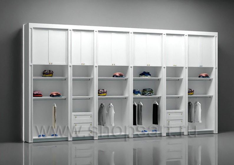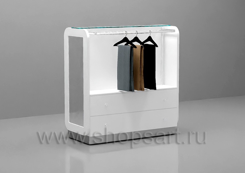 Шкаф предназначен для демонстрации одежды и выкладки товара, укомплектован навесными кронштейнами для фронтальной и боковой развески одежды. В нижней части торговых секций установлен демонстрационный подиум, на котором можно представить обувь и накопители с выдвижными ящиками для хранения товара. Стеллаж выполнен из белого, матового ЛДСП. Навесные кронштейны для одежды изготовлены из металла с покрытием порошковой краской.