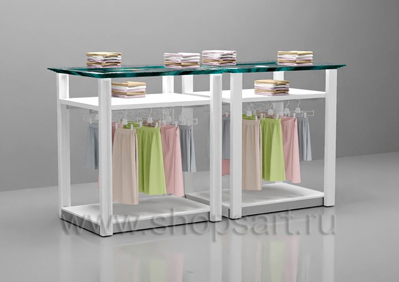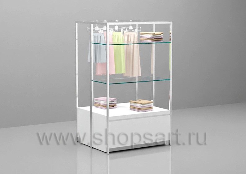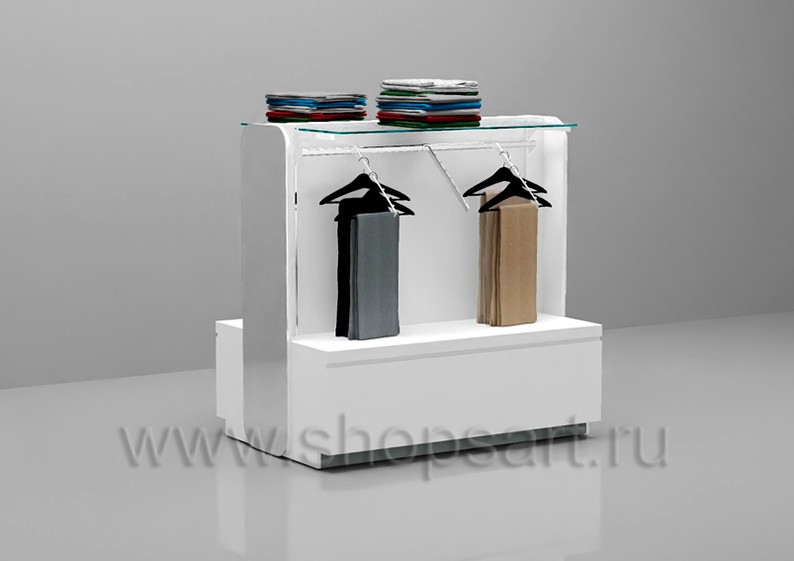 Стойка торговая, островная, устанавливается в центральной части магазина, служит для выкладки дополнительного товара. Сверху стойки размещена стеклянная полка, на которой можно сделать выкладку одежды из трикотажа, представить головные уборы или любой, другой товар. Под полкой монтируется П-образный кронштейн для развески товара.